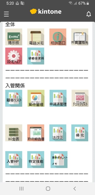 - サイボウズ社のkntonシステムを導入し、案件進捗管理、掲示板、電話メモ、申請済管理、在留期限管理、ファイル管理、顧客管理、チェックリスト管理など業務一元管理を行えるようにしました。
