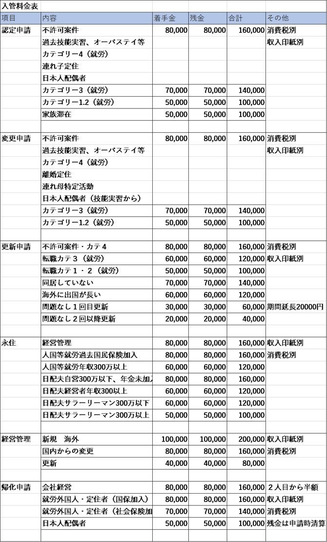 上記金額とは別に、許可取得時に入国管理局へ支払う収入印紙代がかかります。印紙代は別途お客様のご負担となりますのでご了承ください。